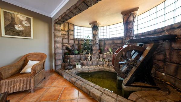 The living areas are beautifully interconnected, offering a natural flow from the formal lounge and dining spaces to a more casual TV room and bar area. The bar, complete with beer tap, opens through stack doors to an entertainers haven featuring a heated swimming pool, boma, gas and built-in braai, and a wood-fired pizza oven. An eye-catching indoor water feature with a functional water wheel adds a touch of tranquility and character to the homes elegant interior.