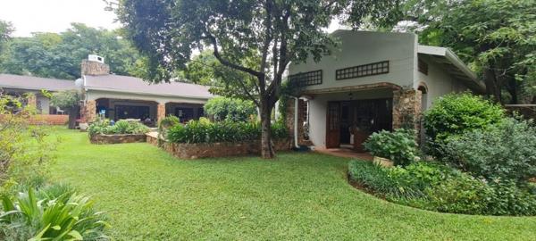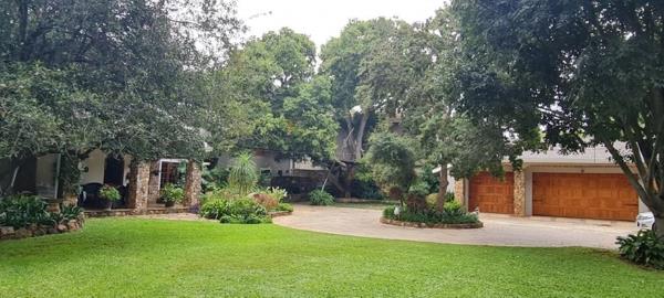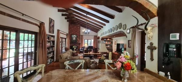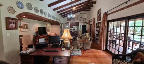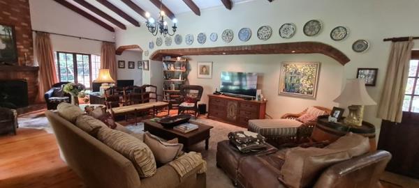 Cosy and spacious TV room with wood fireplace walking onto a spacious patio with build-in braai overlooking the beautiful garden with big trees and sparkling swimming pool.