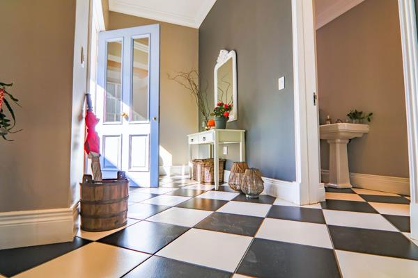 When you enter the house, you will step onto modern black and white tiles and find the guest loo. Then a step down to the main living area opening up onto the lap pool and veranda. To the right is the bedroom wing, furnished with linen cupboards along the elegant hallway. The kitchen with a fireplace is through the stacking doors and the dining room is adjacent. The dining room flows into the indoor braai area, overlooking the boma, lawn area and pool.