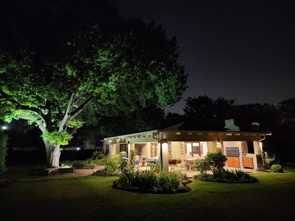 Beautiful lights around the garden at night time showing off the trees and garden.