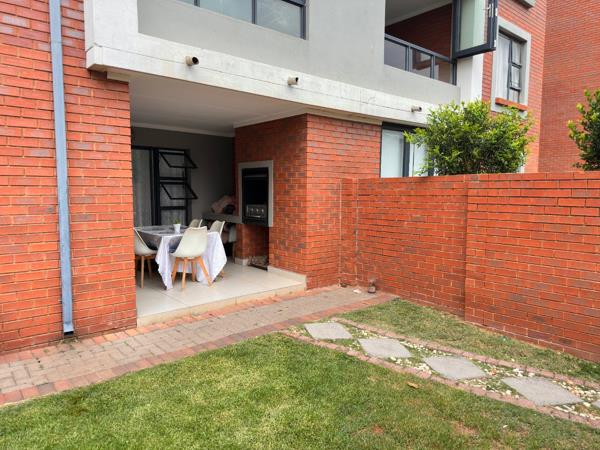 Outdoor living is facilitated by a private covered patio, equipped with a built-in braai, ideal for entertaining. This area extends to a small, private garden, offering a tranquil retreat. Residents benefit from two dedicated parking bays and access to communal amenities, including a swimming pool and clubhouse. Pets are permitted, subject to complex regulations.