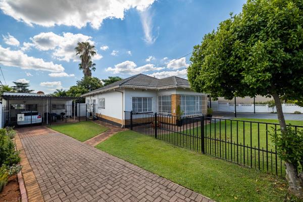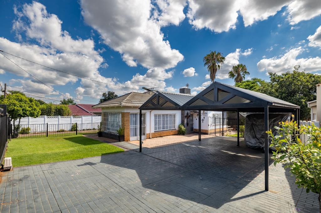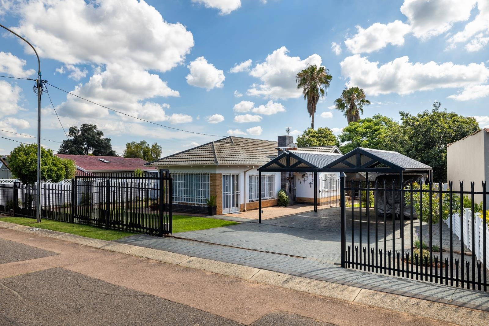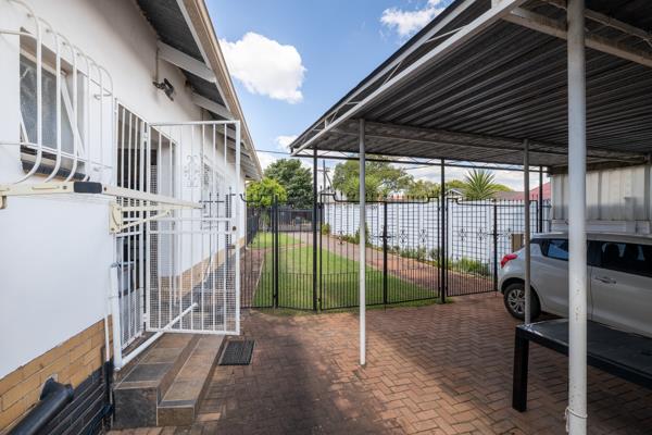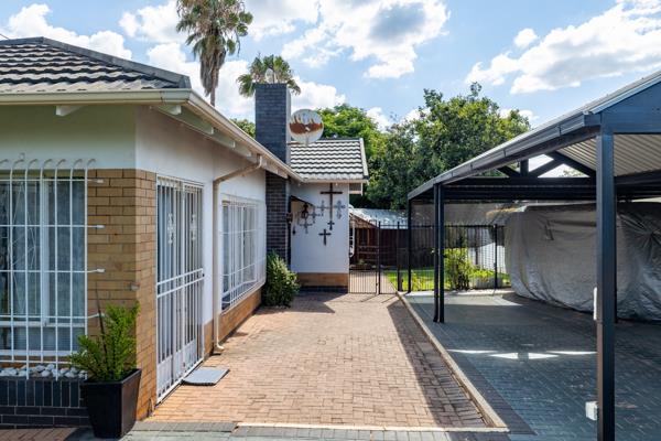 The property presents a functional exterior with a brick-paved courtyard, mature trees, and a concrete privacy fence. A paved driveway leads to a covered carport, providing secure parking for multiple vehicles, complemented by security gates and burglar bars for enhanced safety.