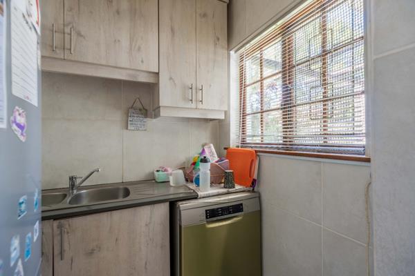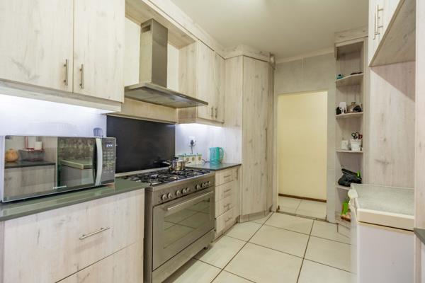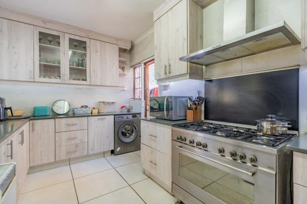 The modern kitchen is a standout feature, boasting Caesarstone countertops, a gas stove with electric oven, and a separate scullery for added practicality. The home is fully tiled and offers five bedrooms or four plus a study all equipped with built-in cupboards and ceiling fans.