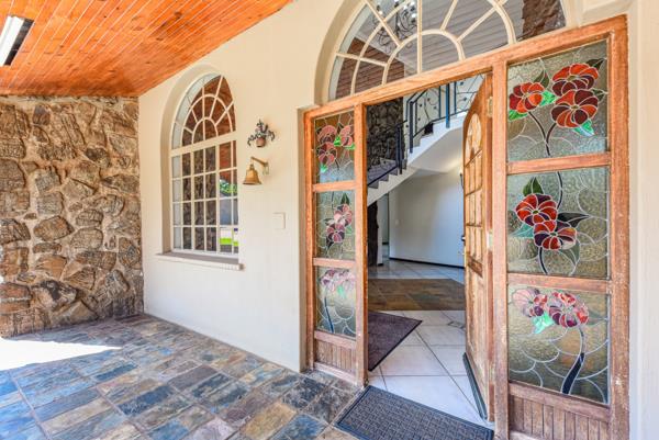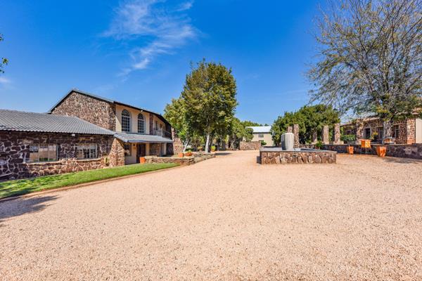 The main residence boasts 7 spacious bedrooms, several with en-suite bathrooms and balconies, multiple open-plan living areas, a modern country-style kitchen with pantry, wine cellar, sauna, and a large entertainment room with built-in bar and braai. The home flows seamlessly to the outdoor spaces, featuring a sparkling pool, lapa, and beautifully landscaped gardens.