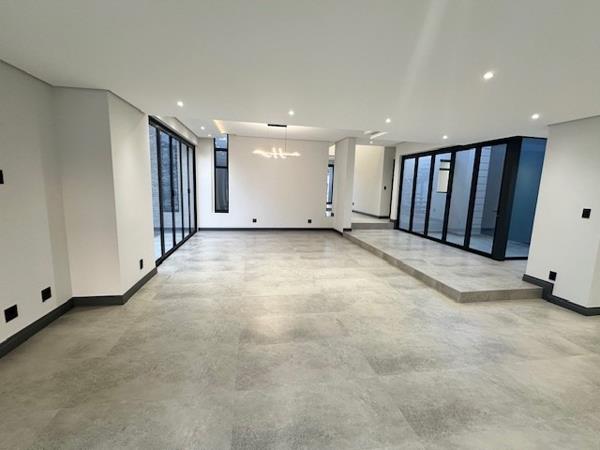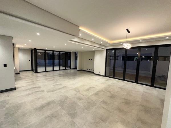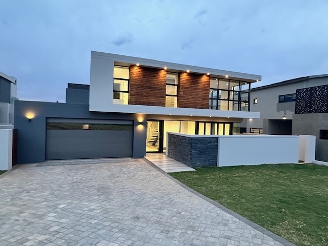 Discover contemporary luxury in this exquisite four-bedroom residence, perfectly situated within the prestigious Eye Of Africa Estate in Eikenhof, South Africa. This modern home boasts a sleek architectural design, featuring clean lines, a sophisticated blend of white stucco, dark accents, and warm wood finishes, creating exceptional curb appeal. Expansive windows and glass sliding doors invite abundant natural light, enhancing the open-plan living spaces.