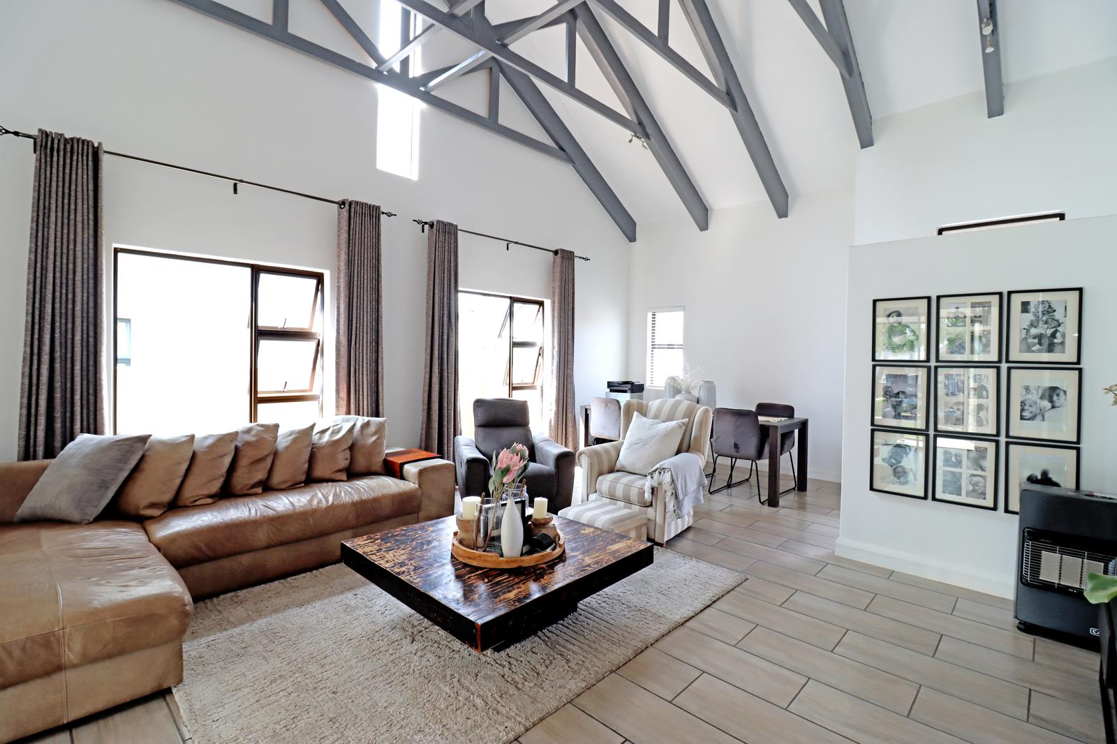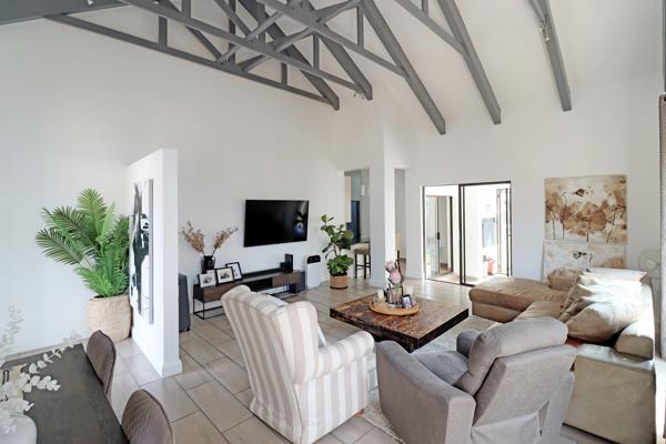 Spacious open-plan living areas with high ceilings and trusses, creating a warm and airy atmosphere