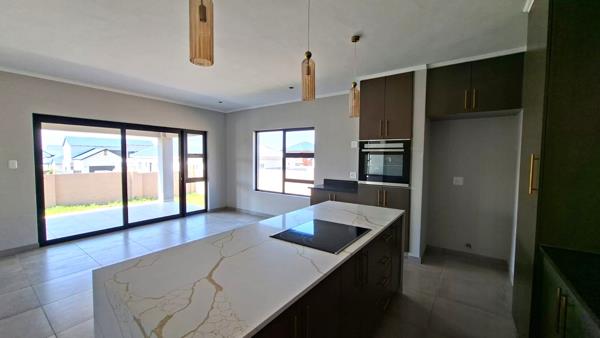 The kitchen, lounge, and dining areas effortlessly extend to the outdoors through glass sliding doors, leading to an open entertainment space with a built-in braai.