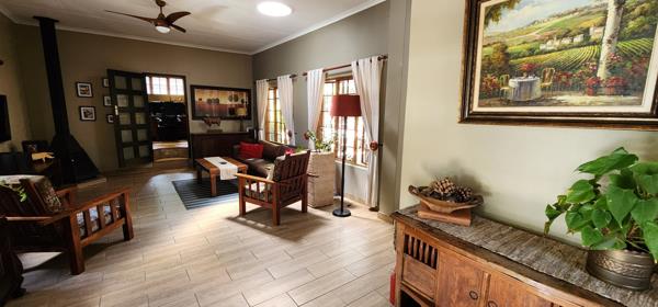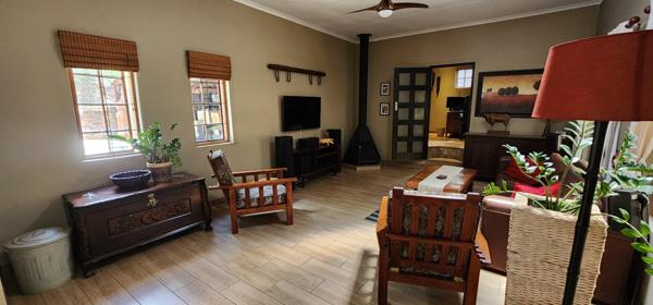 Inviting spacious patio covered by a rain censor louvre deck, and a build in braai overlooking the garden.