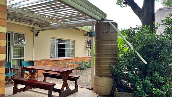 Large Thatched Lapa: A beautiful and spacious entertainment area, perfect for hosting guests or relaxing with family. The lapa overlooks the lush garden and offers a tranquil setting for outdoor dining and leisure.