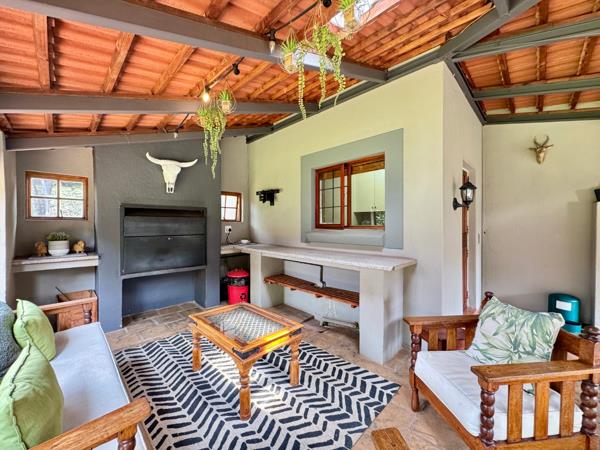The living area downstairs is where the home opens up. A warm-toned kitchen connects seamlessly with the lounge and dining space, creating a natural flow that extends outward into the garden. Step through the wooden doors, and you find yourself on a covered patio with exposed beams, a built-in braai, and space enough to host long, laughter-filled evenings.