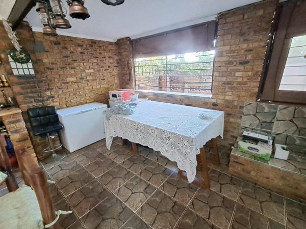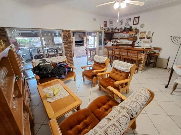 Lounge with built in braai, a bar, and 2 sliding doors.