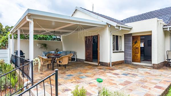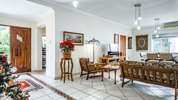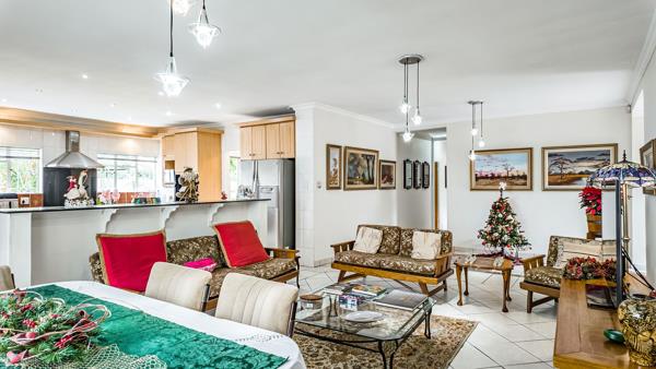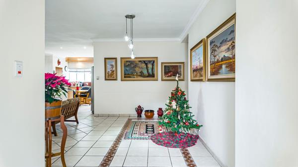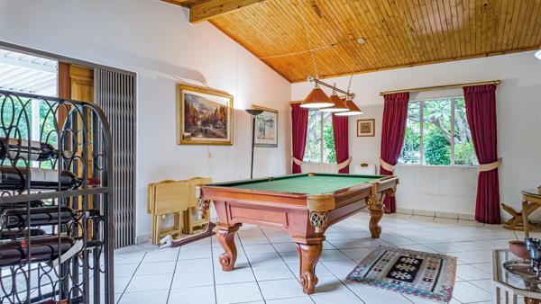 The air-conditioned dining area leads directly into a well-appointed kitchen, complete with ample built-in cupboards, an eye-level oven, space for a breakfast table, and a generous walk-in pantry. The separate scullery offers additional cabinetry, space for two appliances, a double-door fridge, and a convenient built-in garbage disposal splash guard.