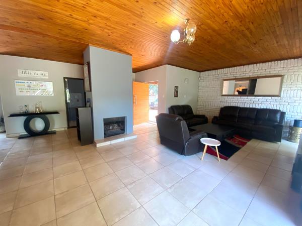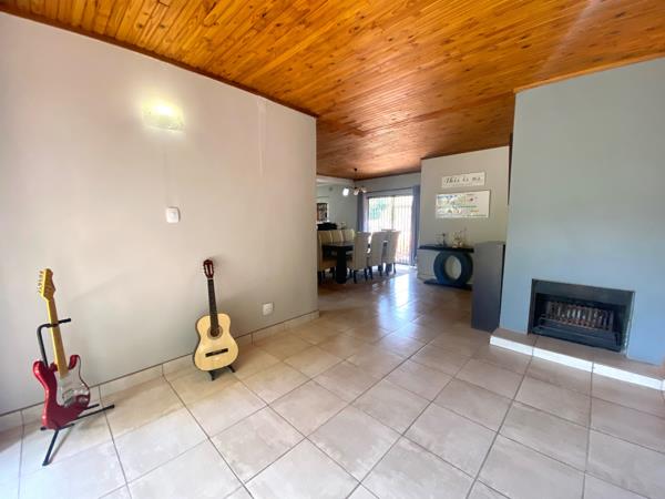 The home welcomes you with an open-plan layout seamlessly connecting the lounge, dining area, and kitchen, creating an inviting atmosphere for everyday living and entertaining. Characterful wooden slat and paneled ceilings add warmth and individuality, complemented by durable tiled flooring throughout. A built-in fireplace enhances the living space, making it perfect for cozy winter evenings.