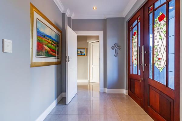 This exceptional property offers a host of modern features designed for convenience and comfort. The downstairs bedroom with en-suite bathroom is ideal for guests or extended family, while the modern kitchen with a double oven and separate scullery ensures effortless entertaining. The home includes garaging for three vehicles with automated doors, two double gates with ample space for trailers or a caravan, and a 2500L water tank for added practicality. Outdoor living is a dream, with a spacious entertainment area featuring a patio, braai, swimming pool, and firepit-style boma. Upstairs, the private living area offers the perfect retreat, with the main suite boasting a private patio, air-conditioning, and a luxurious full bathroom. Additional bedrooms include one with its own en-suite and two sharing a Jack-and-Jill bathroom, all equipped with air-conditioning. Completing the picture is staff accommodation with a private bathroom ensuring comfort and privacy for all.