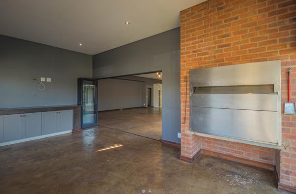 The enclosed patio with built-in braai and stacking doors opens onto a sparkling swimming pool and landscaped garden.