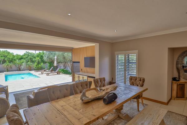 Step inside, and the warmth of high-end finishes and thoughtful design immediately surrounds you. Sunlight filters through American shutters, casting soft patterns across the open-plan living spaces. The dining room, lounge, and kitchen flow seamlessly into one another, creating the perfect setting for both intimate evenings and lively gatherings.