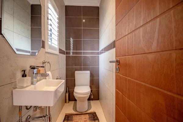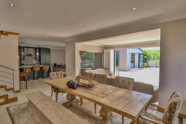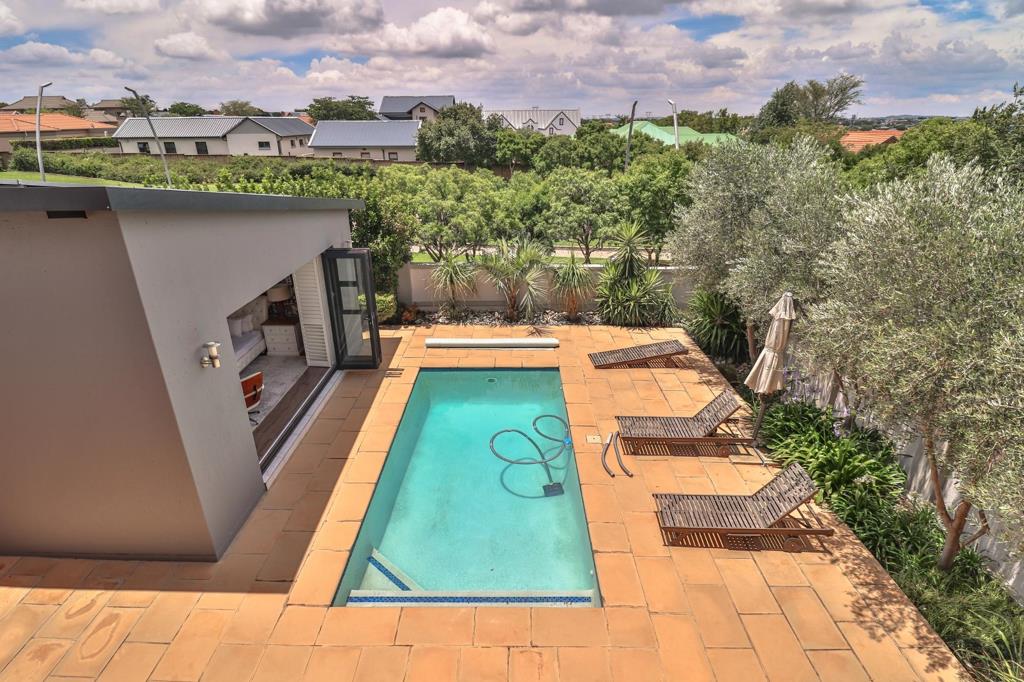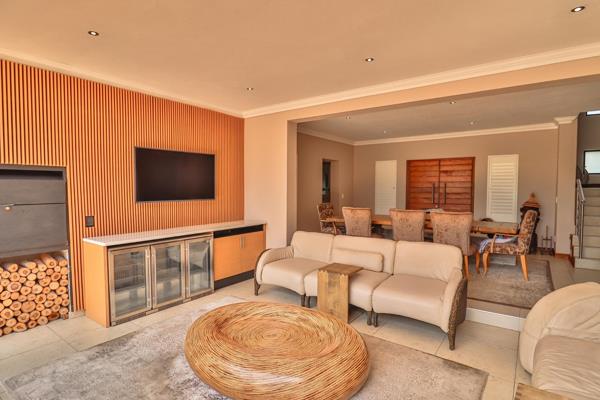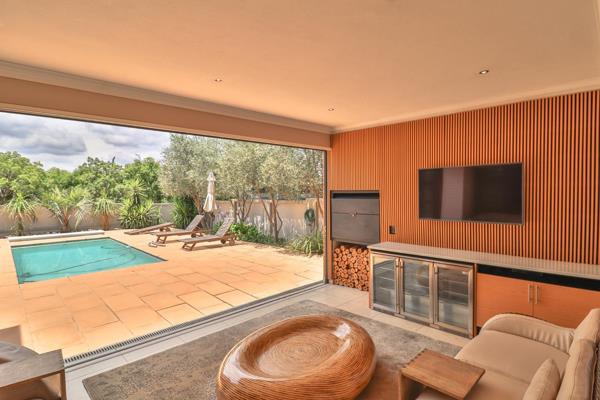 The spacious, enclosed patio stretches out before you, dressed in warm textures and natural tones, complete with a built-in braai and a sleek drinks station. It opens wide to the sparkling swimming pool, letting the inside and outside become one. Imagine weekend braais with friends, kids laughing in the water, or quiet mornings sipping coffee while the sunlight dances on the pools surface.