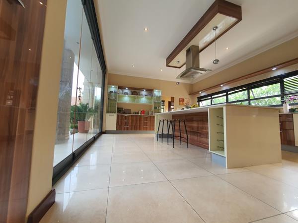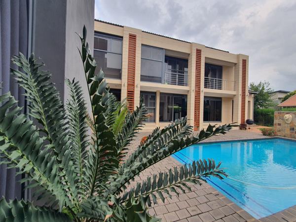 Contemporary Design - Midlands - Guest suite separate. This magnificent home has a formal reception room that leads to a small lounge with a lovely fireplace. To the right, an enormous dining room with fold-up aluminium doors leads into a large open-plan kitchen with ample packing space and a pantry. A separate scullery and separate laundry room are added advantages. To the left of the reception area, a large office work space is situated with entry from the main home and exit through a sliding door to the entertainment space with a 12 meter swimming pool. The home is designed with the pool as central attention and all bedrooms, living space and kitchendining area can lead to the pool or overlook the pool area. A fully equiped guest-suite is situated on the ground floor with a separate entrance and with its own enormous full bathroom. Next to this is a bar area and enclosed braai area. Once upstairs, the open-plan lounge or family tv room follows. Its a true meeting place for the entire family. To one side, three large bedrooms follow and the main bedroom is separate and private with large balcony that overlooks the pool, plenty cupboards and a large bathroom with shower and family-jacuzzi-bath.