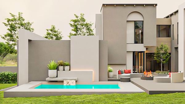 The heart of the home features an open-plan design that encompasses a modern kitchen, spacious dining area, inviting lounge, and a covered patio. Experience the joy of indoor-outdoor living with the patio''s built-in braai and picturesque views of the garden, complete with a BOMA, firepit, and a refreshing pool.