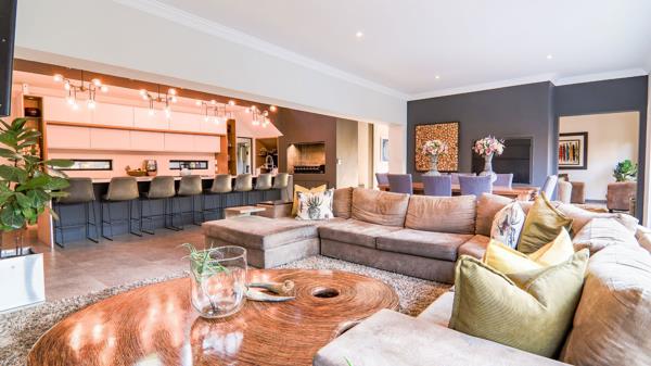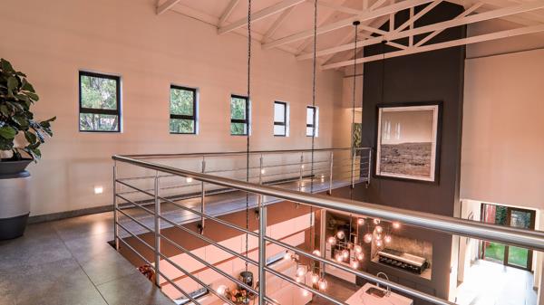 The home has a downstairs guest bedroom with en-suite bathroom and separate guest toilet, two work spaces are made available, one office and beauty room with specially installed water points for hairdressers or those in the beauty industry. From there the home unfolds in a large double volume white kitchen with modern lights and large open lounge area with indoor braai and fold-up doors to the pool deck. It further extends to a 2nd lounge and dining and a special-designed wine cellar. A double staircase takes you up to the private main bedroom with totally modern and refurbished en-suite bathroom and dressing area. A 2nd door opens up to the private gym and covered balcony. Another four bedrooms follow from there. All bedrooms are en-suite with one exception that was turned into a dedicated research room & office upstairs.
