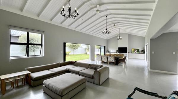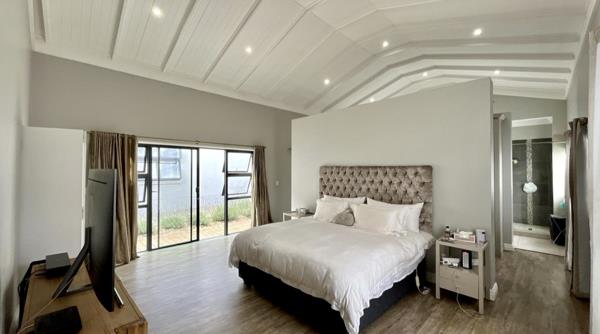 The expansive dining and lounge area opens effortlessly through aluminum stacking doors to a beautifully landscaped, yet easy-to-maintain garden complete with a boma. The lounge also boasts a built-in wood braai, making it ideal for year-round entertaining.