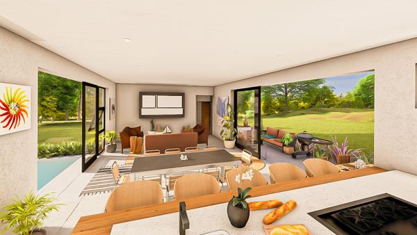 Step into the foyer and let the impressive staircase make a statement, setting the tone for the modern elegance that awaits. The living area beckons, boasting an open-plan kitchen, dining room, and lounge, all adorned with sliding doors that lead to the open patio. Here, you will enjoy views of the pool, BOMA with a built-in braai, countertop with prep bowl, and built-in seating, creating the perfect setting for outdoor entertaining. With ample space in the garden, there is plenty of room to add your own amenities and personalize your outdoor oasis.