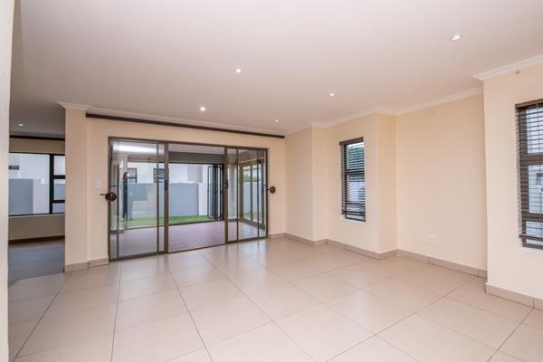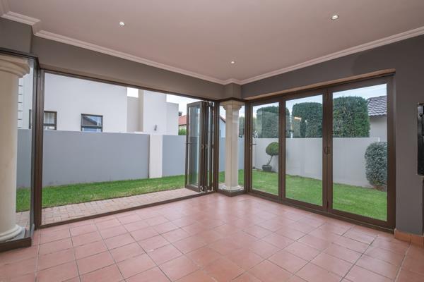 - Enclosed patio with a built-in braai and doors opening up onto the garden.