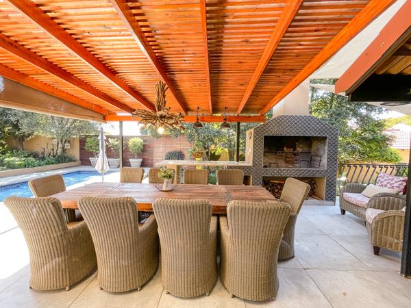 -This impressive property also offers spacious living areas. A cozy formal lounge with built-in braai and wooden wall-to-wall Study unit. Dining Room and separate Bar area. ALL living areas open with stack, slide and double glass doors onto the outside covered patio and built-in braai area and perfectly landscaped garden. Ideal for entertaining family and friends.