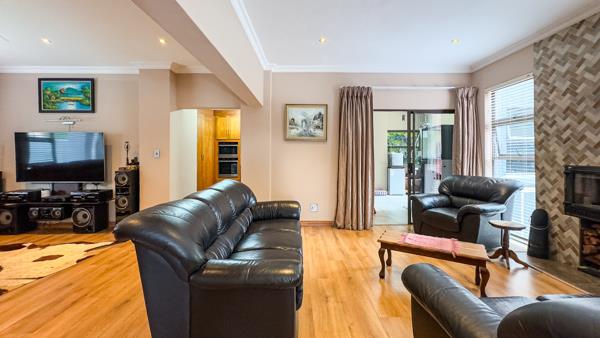 Enclosed, and undercover patio with built-in braai that leads to the garden with open seated patio in a landscaped and treed area.