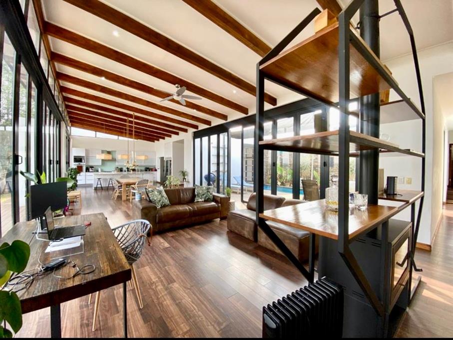 Carefully crafted to embrace natural light and highlight the stunning views, the home boasts expansive stacking doors that seamlessly connect the indoor and outdoor living areas. With lofty ceilings and an abundance of windows, the space radiates a tranquil, open ambiance, bringing the beauty of nature indoors.