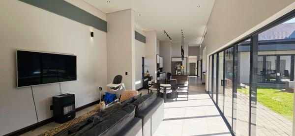 Entertainment is made effortless with a private lounge that features a cosy fireplace and stacking doors leading out to the covered patio with a built-in braai. A tranquil boma area enhances the gardens charm, creating the perfect ambience for evenings under the stars.