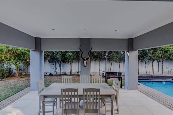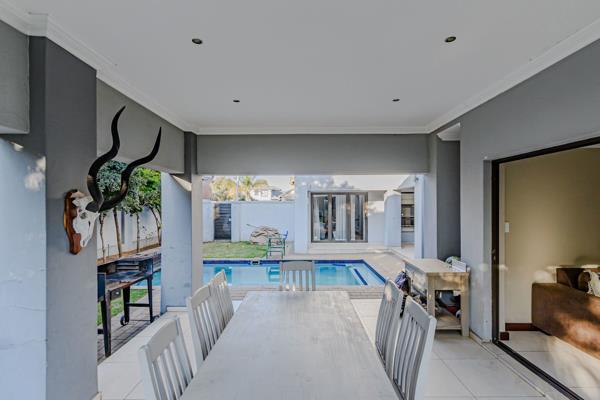 The open-plan design creates a sense of spaciousness and ease, where the lounge, dining room, and family living area blend harmoniously, all opening onto a covered patio and sparkling pool through elegant stacking doors.