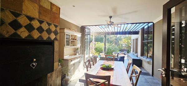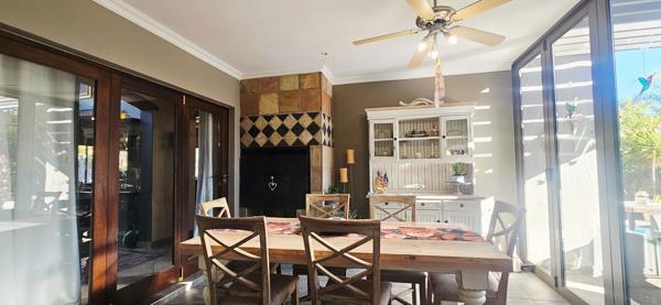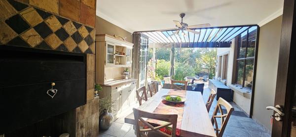The enclosed braai room extends onto an open patio, landscaped garden, and a boma where fires crackle in winter and barefoot children dance in summer. The swimming pool glistens in the afternoon sun, embraced by flowering trees and fruitful vines that echo a slower, more meaningful rhythm of life.