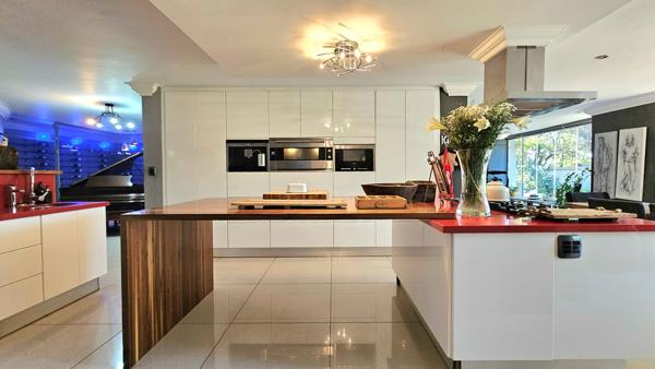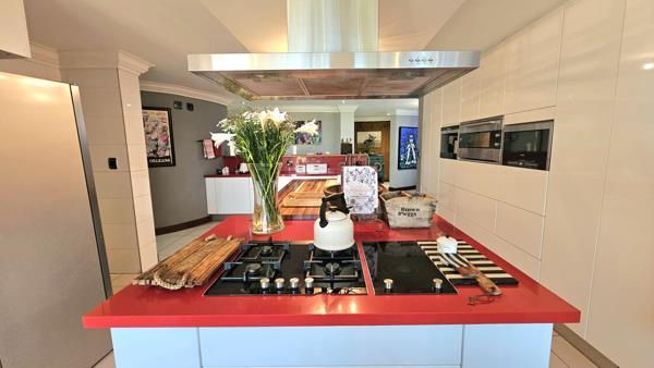 The well-appointed kitchen features white wrapped melamine cabinets with red Ceasarstone work surfaces. The appliances are all Siemens and features an integrated bean-to-cup coffee machine, integrated microwave and 90 cm eye level multi-function oven. Built into the large kitchen island is a 4-burner gas hob and 2 plate electric hob, under a 90cm Siemens Island extractor.
