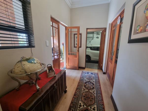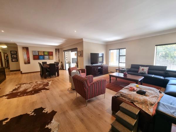 Walking into a lovely entrance hall, closed study and guest toilet. The living and dining room is build as an open plan with the kitchen. They kitchen offers ample of cupboard space, gas stove, electric oven and a large breakfast nook. The scullery is perfect to hid the dirty dishes, and also offers space for 3 appliances (including a Top Loader space). Outside there is a storage room and ensuite staff quarters, as well as 2 automated garages.