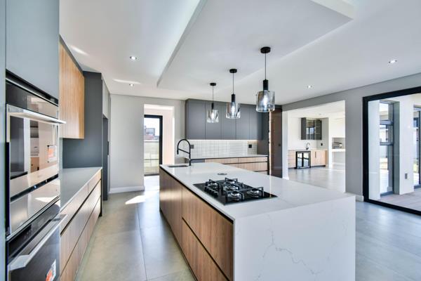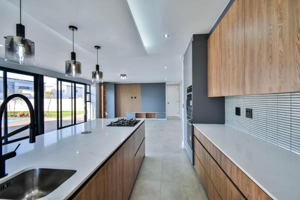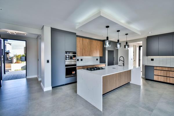The heart of the home lies in its modern open-plan kitchen, complete with a stylish center island, gas hob, double eye-level oven, ample cupboard space, and a walk-in pantry. A separate scullery ensures practicality, with space for all appliances.