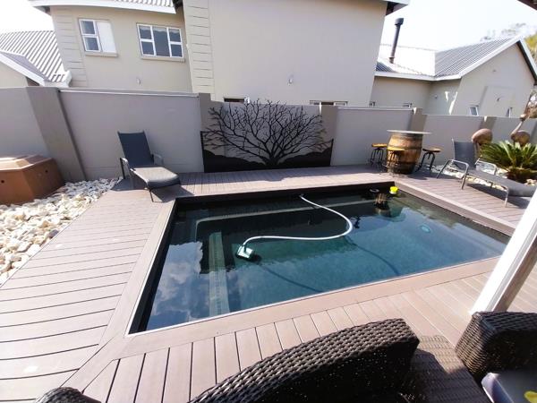 Manicured, low-maintenance garden with composite wooden deck 18 years manufacturer''s warranty remaining, sparkling pool with cover and installed gazebo.