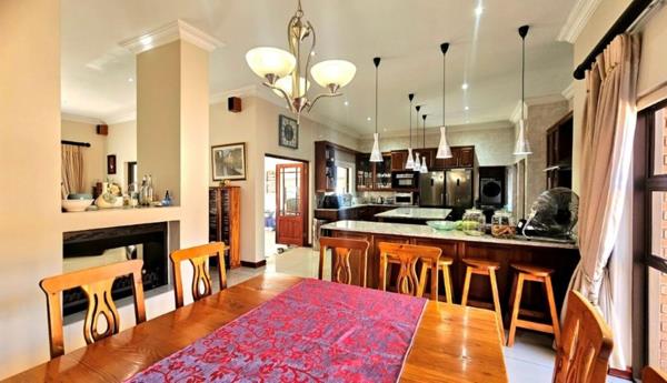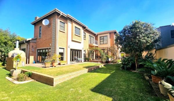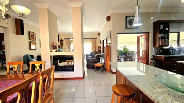 Two expansive lounges are linked by a double-sided fireplace, with sliding and stacking doors that dissolve the boundary between indoors and out. The patio itself is a dream: enclosed for year-round use, fitted with a braai and authentic built-in pizza oven, and overlooking a manicured garden where evenings unfold beneath the stars.