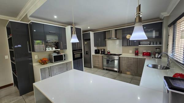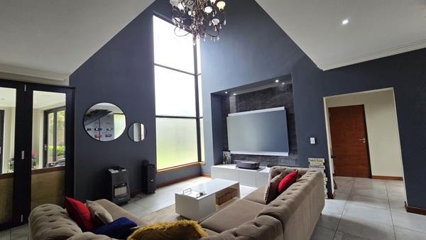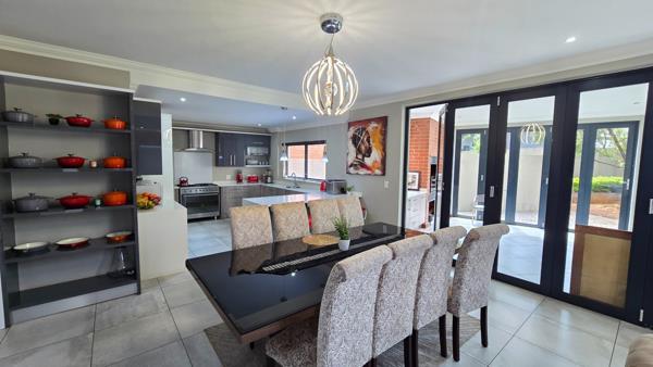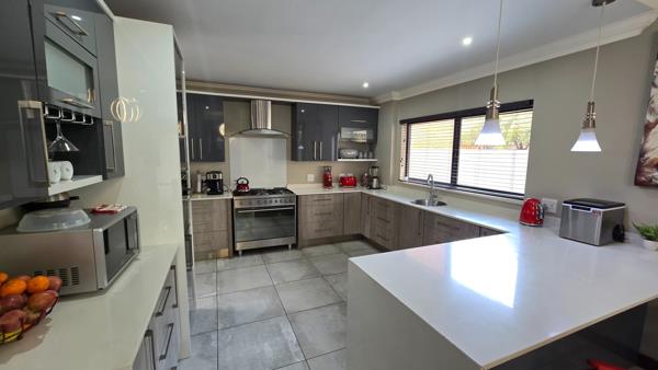 The gourmet kitchen is equipped with contemporary finishes and stainless steel appliances, featuring a practical pantry and ample storage, ideal for culinary pursuits. Large glass stacker doors facilitate an effortless transition to the outdoor area, which includes a built-in braai, perfect for entertaining. A versatile pajama lounge with study nook, overlooks the main living area, offering additional relaxation spaces. The residence comprises of three well-appointed bedrooms, including a luxurious en-suite bathroom, complemented by an additional full bathroom and a convenient guest toilet, ensuring comfort and privacy for all occupants.