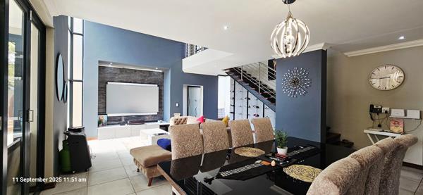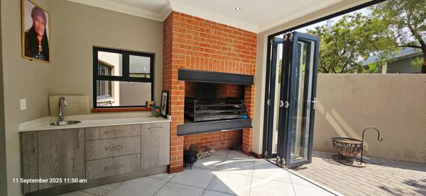 Midstream Ridge Grandeur . Framed by immaculate kerbs and soft garden greenery, this double-storey residence sits with quiet confidence on one of Midstream Ridges serene streetsmodern, polished, and irresistibly pretty from first glance. Step through the impressive entrance and the home opens with effortless flow: a sun-laced open-plan living and dining area anchored by a beautifully appointed kitchen, where a generous galley-style utility/scullery keeps the practicalities discreet. Stacking doors glide away to reveal the under-roof braai terracean all-season entertaining spacewhile a second set of stackers draws the garden into daily life, so that weekends feel like holidays and weeknights feel unhurried.