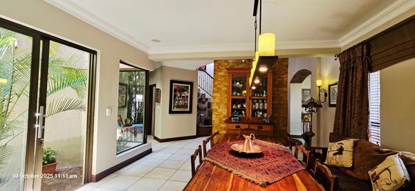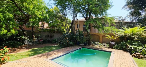 Outdoors, a covered entertainment patio with built-in braai looks over a sparkling pool and an exceptional, established gardenlush lawns, layered beds and an overall sense of privacy that makes weekends feel like a small holiday. It is easy to imagine birthday parties here, slow Sunday lunches, and moonlit swims after a Highveld thunderstorm.