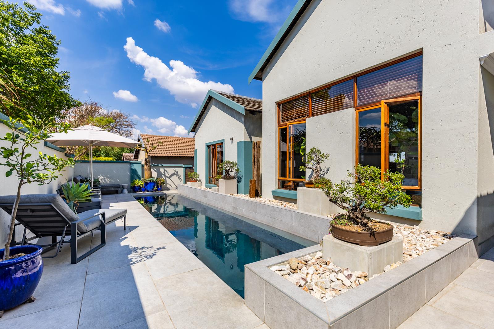 An expansive covered patio looks over a solar-heated lap pool, perfect for summer swims and year-round enjoyment. Solar panels and an inverter system power not only the pool but the entire home, offering peace of mind and load-shedding resilience.