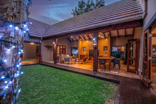 - Covered entertainment area with built-in braai, feature wall, lounge, and dining space opening onto a serene courtyard garden.