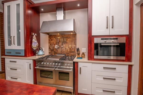 - Spacious country kitchen with room for a dining table, large island, composite stone finishes, gas stove, electric oven, walk-in pantry, and an expansive scullery with ample storage.