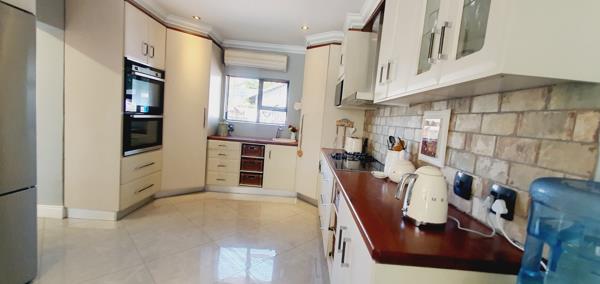 * Modern chef''s kitchen with a solid wood breakfast island, gas and electric ovens, two eye-level ovens, a wine cooler, and a separate scullery with space for three appliances,