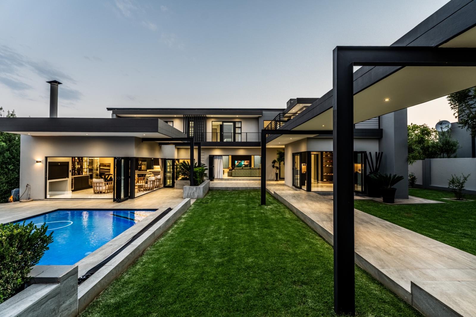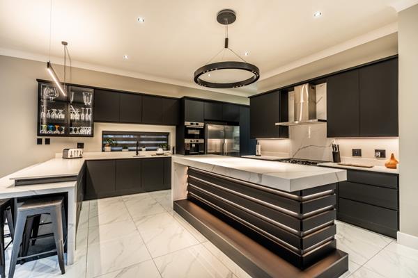 Downstairs also includes the entertainment - a striking bar area with sleek shelving with integrated LED lighting adding an ambient glow that enhances the luxurious atmosphere. The indoor braai area is perfectly positioned for effortless hosting.
