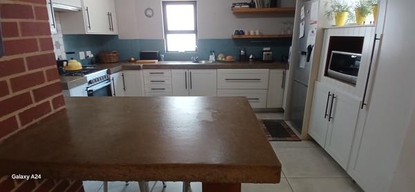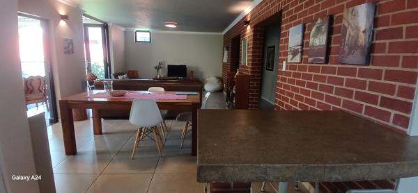 The open-plan living and dining areas flow seamlessly onto a large patio with a built-in braai, ideal for family gatherings and entertaining. The kitchen features a gas stove and a separate scullery/laundry area for added convenience.