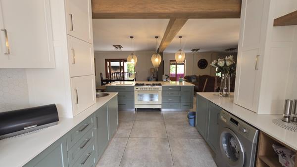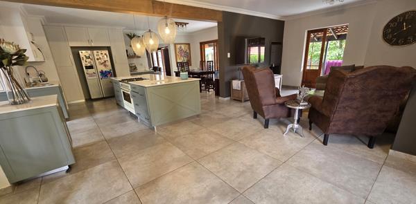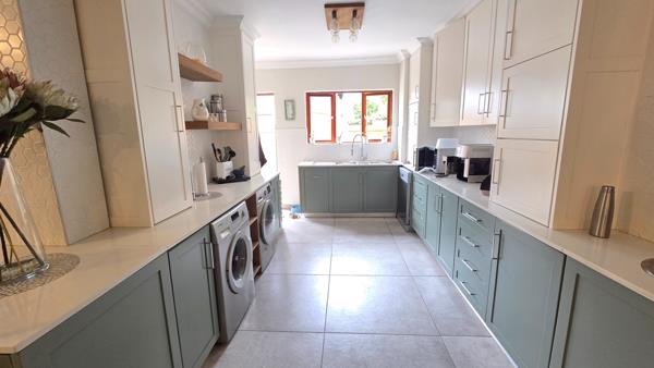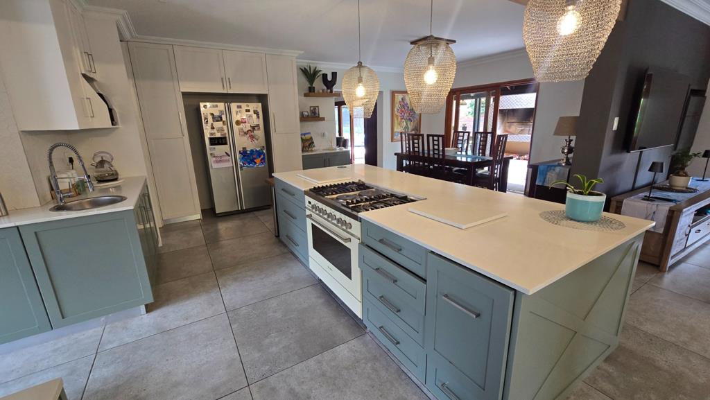 Step inside to discover a thoughtfully designed interior spanning 475 sqm, featuring an inviting entrance hall and an open-plan layout that seamlessly connects living, dining, and entertainment zones. The heart of the home is its modern kitchen, equipped with stylish two-toned cabinetry, light countertops, and a large island featuring an integrated gas and electric hob and oven. This bright and spacious kitchen flows effortlessly into the dining area and multiple lounges: a formal lounge at the front of the house and a family TV room towards the back of the house, with doors that lead out to the covered patio.