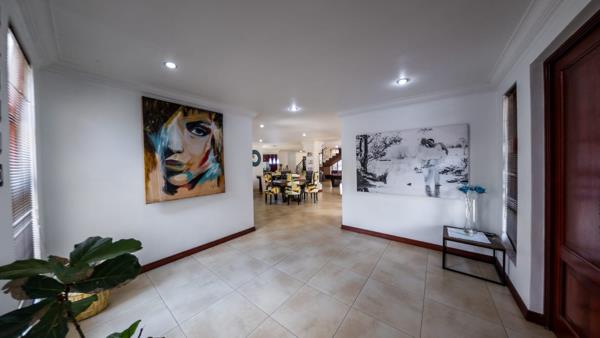 A majestic central staircase anchors the home and leads to five spacious bedrooms upstairs. The main suite is an elegant retreat, large enough for a full lounge set, a sanctuary for parents to unwind in privacy. The remaining four bedrooms are equally generous, with two sharing a modern full bathroom, making it ideal for children or guests.