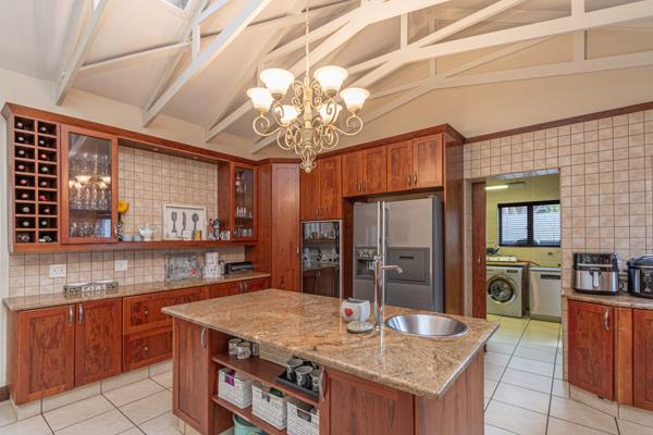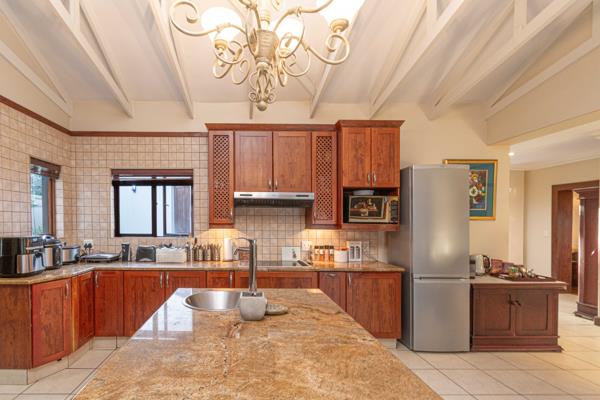 The kitchen is a standout feature, showcasing exposed roof trusses, a central island, a spacious pantry cupboard and a private scullery. An air-conditioner ensures year-round comfort. The adjoining dining area flows effortlessly into the garden through double doors, making it an inviting space for relaxed meals and effortless entertaining.